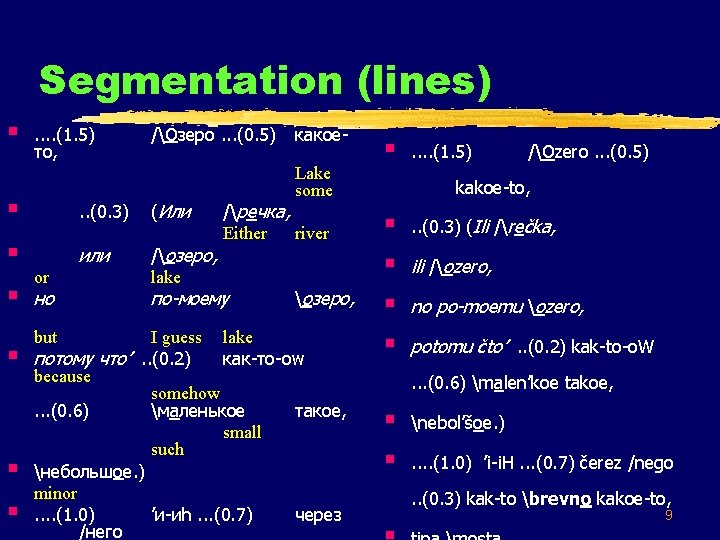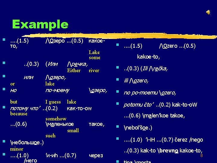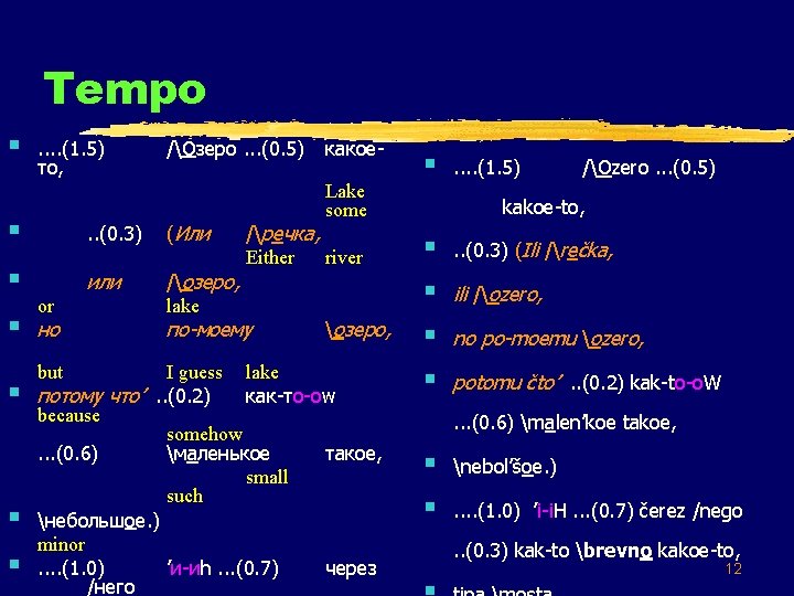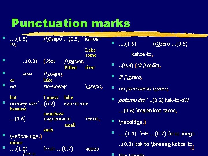 Other prosodic phenomena § . . (1. 5) то, /Озеро. . . (0. 5) § . . (0. 3) (Или § или /озеро, lake § § or но but какое. Lake some /речка, Either river по-моему озеро, I guess lake потому что’. . (0. 2) как-то-оw because somehow. . . (0. 6) маленькое такое, small such небольшое. ) minor. . (1. 0) ’и-иh. . . (0. 7) через /него § . . (1. 5) /Ozero. . . (0. 5) kakoe-to, § . . (0. 3) (Ili /rečka, § ili /ozero, § no po-moemu ozero, § potomu čto’. . (0. 2) kak-to-o. W. . . (0. 6) malen’koe takoe, § nebol’šoe. ) § . . (1. 0) ’i-i. H. . . (0. 7) čerez /nego. . (0. 3) kak-to brevno kakoe-to, 13