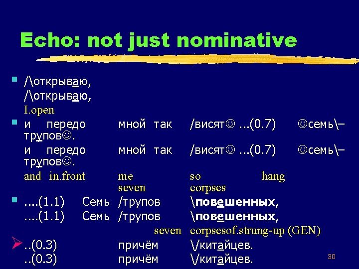 Echo: a typical example § Бегала Begala Was. running бездомная /собака, bezdomnaja /sobaka, homeless dog Ø. . (0. 2) /большой дог, . . (0. 2) /bol’šoj dog, такой /чёрный takoj /čërnyj big black such Great. Dane 28