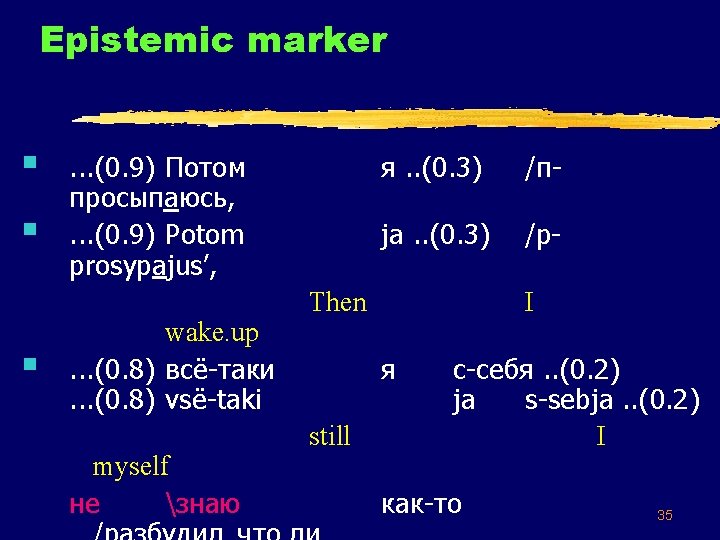 Long EDUs: some sources § Finite verbs > epistemic markers § Finite verbs > quotative markers § Verb serialization 34