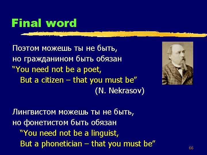 Conclusion § § § Basic phenomena are same or comparable There are specific differences – basis for future typological research Focusing on spoken language and prosody really affects a linguist's understanding of what is important in grammar and what grammar is about Languages with a tradition of literacy, and strong emphasis on their written form, appear very different if looked at in their oral form For the languages with a lesser or no tradition of literacy, it is not less important to pay attention to a systematic representation of their sound shape, especially prosody 65