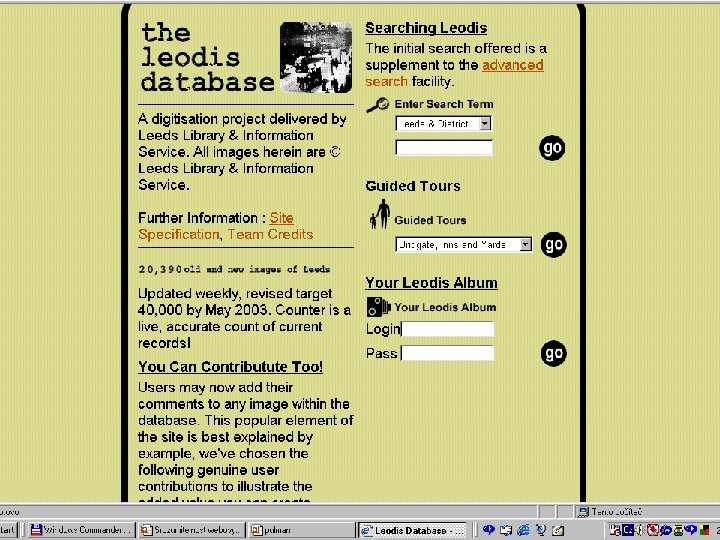 Velká Británie • Leodis (databáze 20 390 starých a nových obrázků Leedsu budovaná leedskou knihovnou) - HW: Win 2000 server - SW: aplikace Active Server Page napsaná ve VBScript - data uložena a vyhledávána přes MSSQL 7. 0, 72 dpi jpg a jako 300 dpi tiff offline)