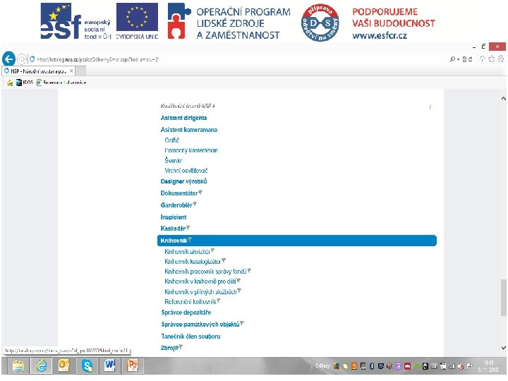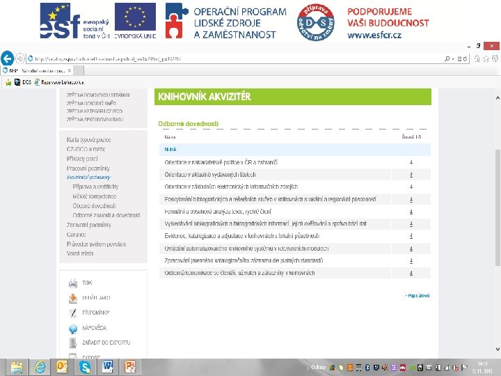 NSK • Schváleno 6 PK pro úroveň 4 (SŠ) • Knihovní akvizitér, Knihovník katalogizátor, Knihovník pracovník správy fondů, Knihovník v přímých službách, Referenční knihovník, Knihovník v knihovně pro děti • MK ČR může spustit proces autorizace