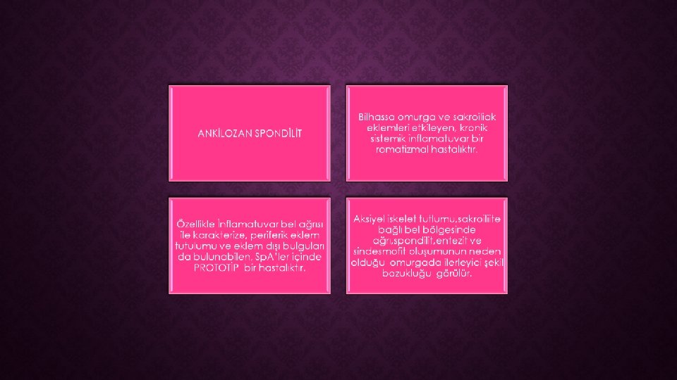 SPA’nın PROTOTİP HASTALIĞI ANKİLOZAN SPONDİLİT OMURGA ve SİE’LERİ ETKİLEYEN İNFLAMATUVAR BEL AĞRISI PERİFERİK EKLEM TUTULUMU KIS DIŞI TUTULUM ENTEZİT/SİNDESMOFİT OMURGADA İLERLEYİCİ ŞEKİL BOZUKLUĞU KRONİK, İNFLAMATUVAR HASTALIK