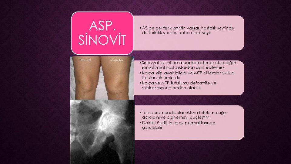 ASP İÇİN MODİFİYE NEW YORK KRİTERLERİ (1984) RADYOLOJİK DİREKT SİE GR. de 2 TARAFLI GRADE 2 Sİİ DİREKT SİE GR. de TEK TARAFLI GRADE 3 -4 Sİİ KESİN ANKİLOZAN SPONDİLİT İÇİN; RADYOLOJİK BULGU ve HERHANGİ BİR KLİNİK KRİTERİN BULUNMASI, KLİNİK İNFLAMATUVAR BEL AĞRISI LOMBER OMURGANIN SAGİTAL VE FRONTAL HAREKETLERİN DE KISITLANMA GÖĞÜS EKSPANSİYONU NUN KISITLANMASI OLASI ANKİLOZAN SPONDİLİT İÇİN; ÜÇ KLİNİK KRİTER VARLIĞI VEYA RADYOLOJİK KRİTERLERİN KLİNİK KRİTERLER OLMADAN BULUNMASI GEREKİR.