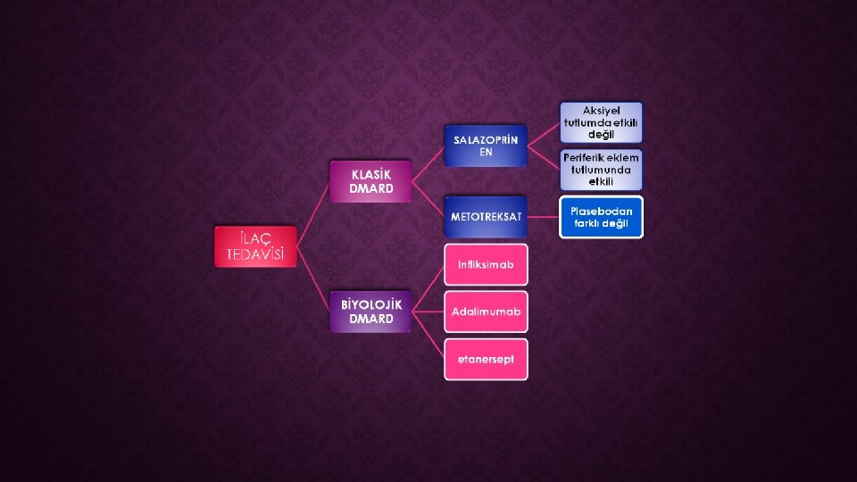 PERİFERİK EKLEM TUTULUMUNDA ETKİLİ İLAÇ TEDAVİSİ SULFOSALAZİN AKSİYEL TUTULUMDA DEĞİL !!! KLASİK DMARD METOTREKSAT İNFLİKSİMAB ADALİMUMAB BİYOLOJİK DMARD GOLİMUMAB ETANERSEPT PLASEBODAN FARKLI DEĞİKL