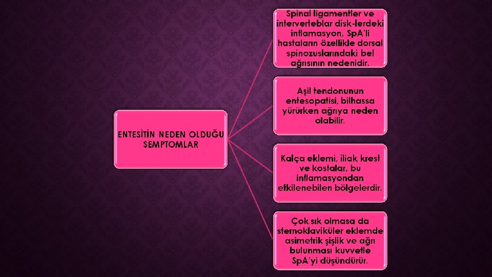 ENTEZİT • TENDON/LİG. KEMİĞE YAPIŞMA YERİNDE İNFLAMASYON SEMPTOM/B ULGU VERTEBRAL LİG. • LOKAL AĞRI • YENİ KEMİK OLUŞUMU • SİNDESMOFİT • BAMBU KAMIŞI VERTEBRA GÖRÜNÜMÜ