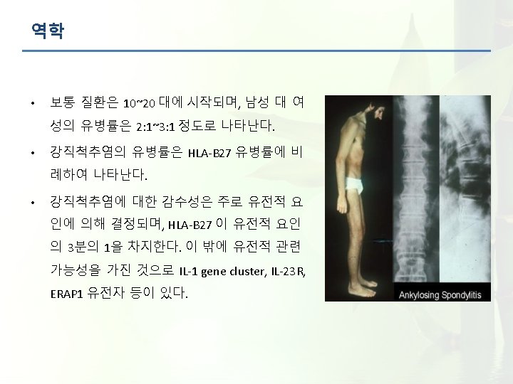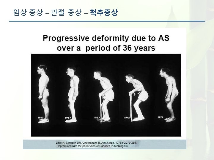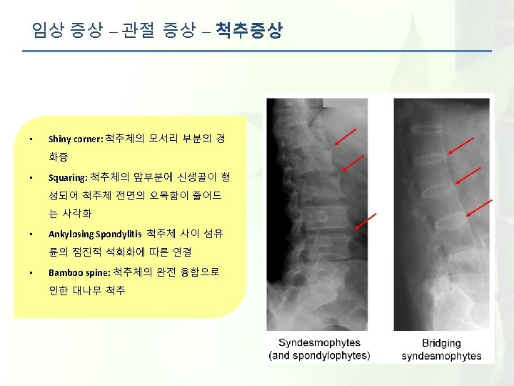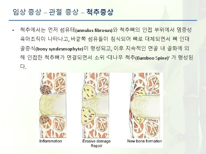 임상 증상 – 관절 증상 – 척추증상 normal ankylosis Bamboo spine