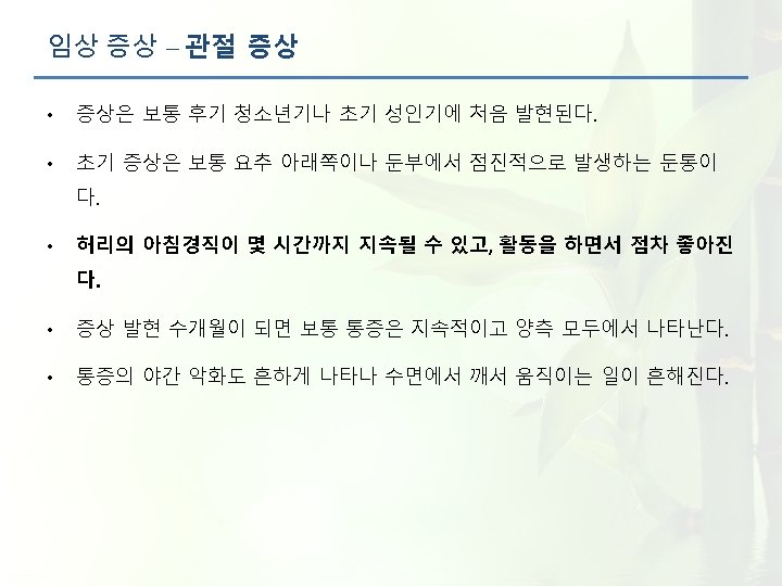 임상 증상 – 관절 증상 – 말초관절증상 • 일부 환자는 부착부염을 의미하는 뼈의 압통이