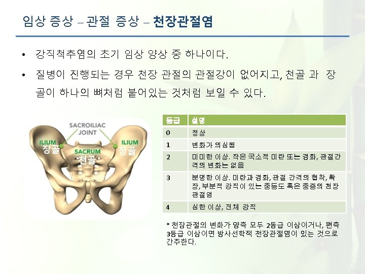 천장관절염 단계별 영상검사 소견 Sacroiliitis Grade 0 (Normal) Grade 2 Bilateral Sacroiliitis In a
