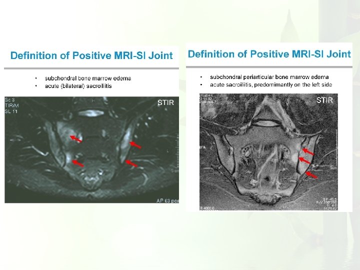 천장관절염 단계별 영상검사 소견 Sacroiliitis Grade 0 (Normal) Grade 2 Bilateral Sacroiliitis In a 15 -Year-old Boy Grade 3 Bilateral Sacroiliitis Grade 4 Bilateral Sacroiliitis / Right Hip Involvement 28 -Year-Old Male, AS for 16 Years