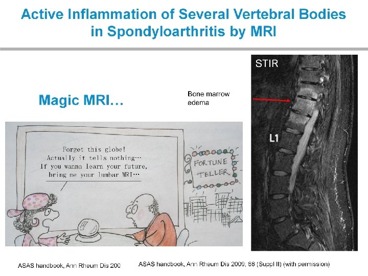 Intended for internal educational purposes only. Subject to local regulatory review prior to external use. 70% Inflammatory Back pain 30% Asymmetric peripheral arthritis X-ray : Sacroiliitis Enthesitis MRI : Sacroiliitis ESR / CRP Good response to NSAIDs Uveitis 40%