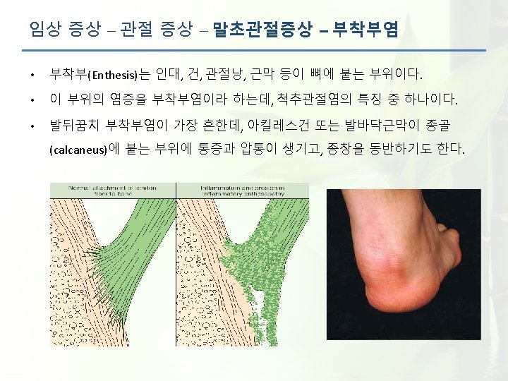 임상 증상 – 관절 증상 – 말초관절증상 • 일부 환자는 부착부염을 의미하는 뼈의 압통이 동반된다. • 말초 관절염은 보통 비대칭적이며, 환자들의 30% 정도에서 나타난다. 이는 질병의 어 느 단계에서든지 나타날 수 있다. Enthesitis (골부착염) Peripheral arthritis (말초관절염) Dactylitis (지염, sausage digit) Asymmetric Monoarticular or Oligoarticular 1. Cruyssen BV et al. Ann Rheum Dis 2007; 66: 1072 -1077 2. Sidiropoulos PI et al. Rheumatology 2008; 47: 355 -361