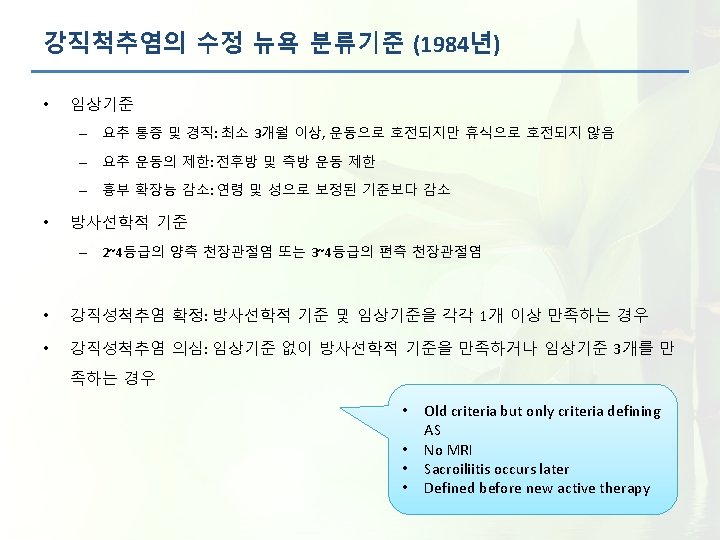 임상 증상 – 관절 증상 – 말초관절염 • 관절염은 비대칭적이고 1~3개의 관절을 흔히 침범한다. 815 patients with definite AS (fulfilling the modified New York [NY] criteria) 22. 6% 27. 9% No peripheral arthritis Monoarthritis ever 37. 5% Oligoarthritis ever 12% Polyarthritis ever (≥ 4 joints) Adapted from De Vlam K. et al. EULAR 2006. Abstract THU 0318