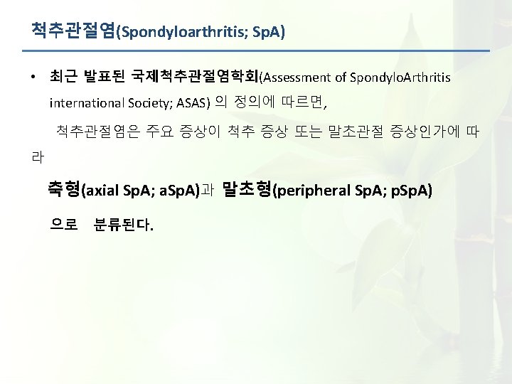 척추관절염(Spondyloarthritis; Sp. A) 척추관절염은 강직척추염(ankylosing spondylitis; AS)과 건선관절염(psoriatic arthritis; Ps. A), 반응관절염(reactive arthritis; Re. A), 염증장질환(inflammatory bowel disease; IBD) 관련 관절염(IBDA), 유년기 발병 척추관절염(juvenile-onset spondyloarthritis; JSp. A), 미분 화척추관절염(undifferentiated Sp. A; USp. A) 등을 포함하는 만성 염증성 류마티스 질환이 다. Undifferentiated Sp. A Ankylosing spondylitis Psoriasis arthritis Sp. A with IBD Reactive arthritis Different Sp. A entities