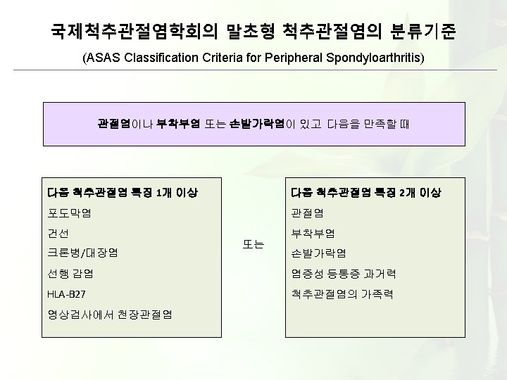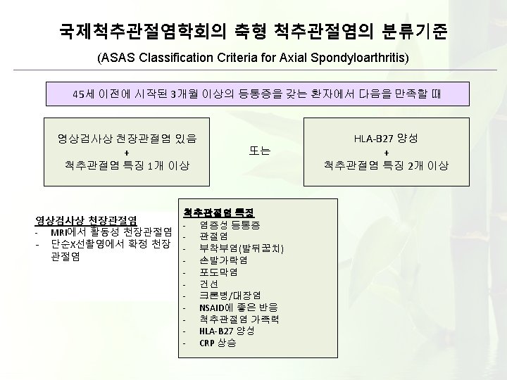 척추관절염(Spondyloarthritis; Sp. A) • 척추관절염 질환들은 공통적으로 천장관절염(sacroilitis) 및 척추염(spondylitis), 주로 하 지에 비대칭적으로 침범하는 소수관절염, 부착부염(enthesitis) 같은 근골격증상과 포 도막염(uveitis), 건선(psoriasis), 또는 염증장질환 같은 근골격외 장기 이환 등의 임상적 특징을 보이며, 유전적으로 HLA-B 27 과 밀접히 연관되어 있다. § Inflammatory back pain § Peripheral arthritis (asymmetric) § Enthesitis § Ocular inflammation (particularly acute anterior uveitis) § genetic association: HLA-B 27(+) § Rheumatoid factor(-): seronegative