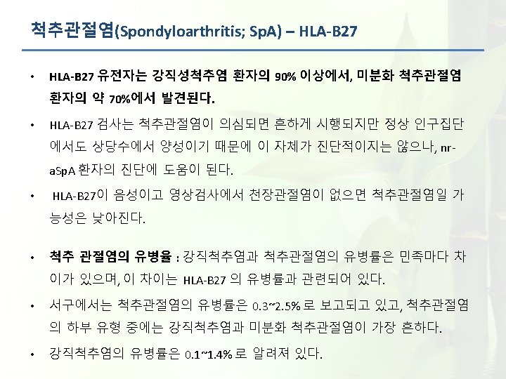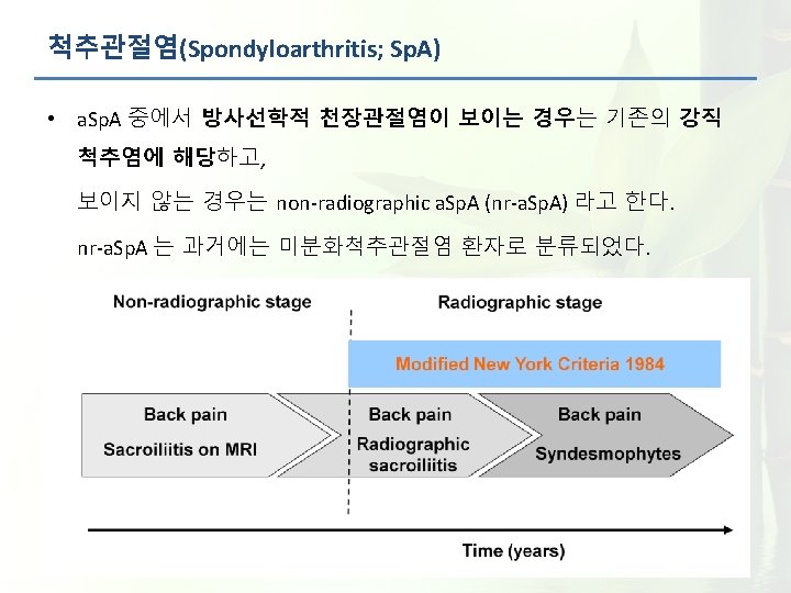 척추관절염(Spondyloarthritis; Sp. A) • 척추관절염 질환들은 공통적으로 천장관절염(sacroilitis) 및 척추염(spondylitis), 주로 하 지에 비대칭적으로