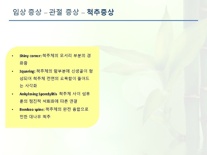 임상 증상 – 관절 증상 – 척추증상 normal ankylosis Bamboo spine