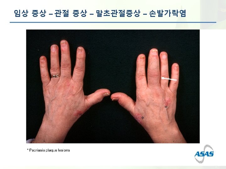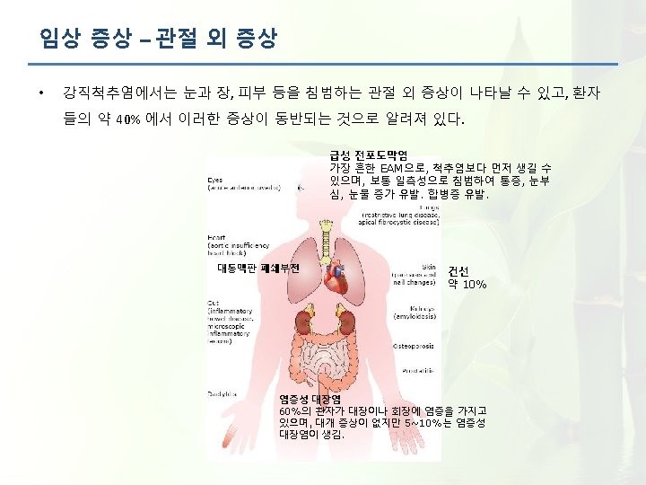 임상 증상 – 관절 증상 – 말초관절증상 • 일부 환자는 부착부염을 의미하는 뼈의 압통이 동반된다. • 말초 관절염은 보통 비대칭적이며, 환자들의 30% 정도에서 나타난다. 이는 질병의 어 느 단계에서든지 나타날 수 있다. Enthesitis (골부착염) Peripheral arthritis (말초관절염) Dactylitis (지염, sausage digit) Asymmetric Monoarticular or Oligoarticular 1. Cruyssen BV et al. Ann Rheum Dis 2007; 66: 1072 -1077 2. Sidiropoulos PI et al. Rheumatology 2008; 47: 355 -361