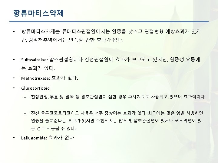임상 증상 – 관절 증상 – 말초관절염 • 관절염은 비대칭적이고 1~3개의 관절을 흔히 침범한다. 815 patients with definite AS (fulfilling the modified New York [NY] criteria) 22. 6% 27. 9% No peripheral arthritis Monoarthritis ever 37. 5% Oligoarthritis ever 12% Polyarthritis ever (≥ 4 joints) Adapted from De Vlam K. et al. EULAR 2006. Abstract THU 0318