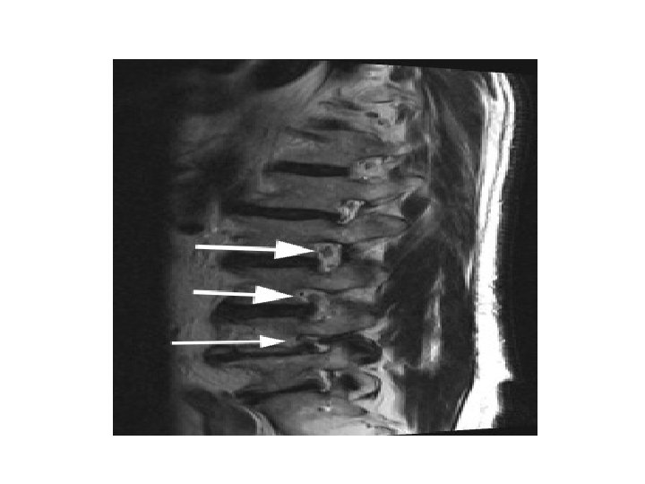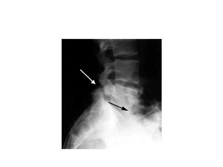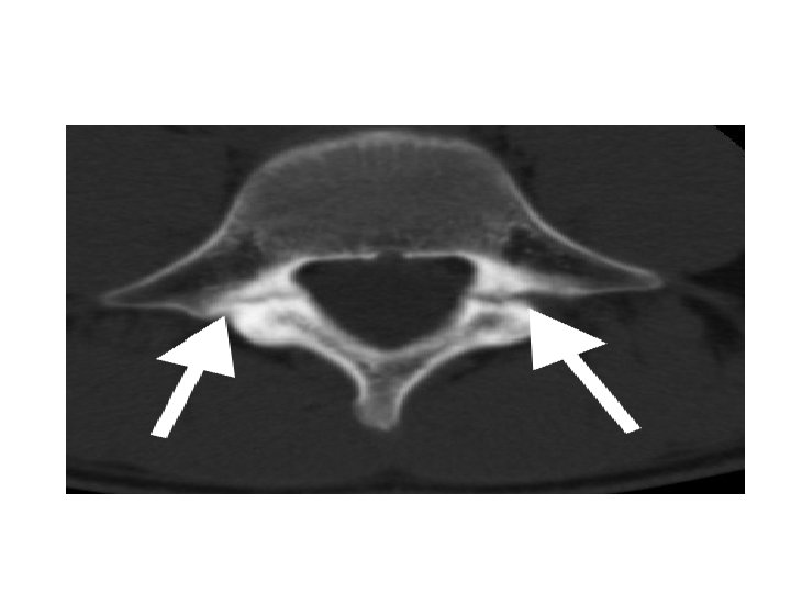 • Clinical presentation : - Symptomatic only in 10% of patients. - Usually come with low back pain aggravated by extension movements. - some discomfort can be elicited with deep percussion over the midline of the lumbar area. No tenderness found. - Full range of movements with normal N. V exam. - The 1 -leg hyperextension test elicits pain on the involved side.