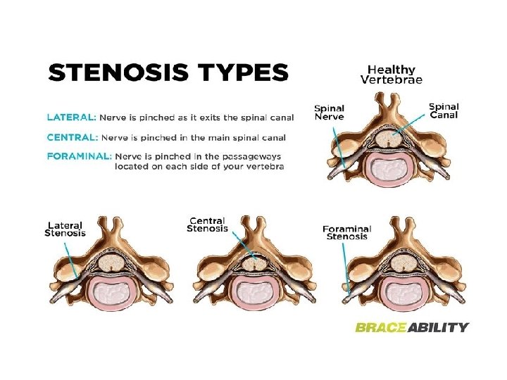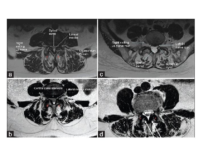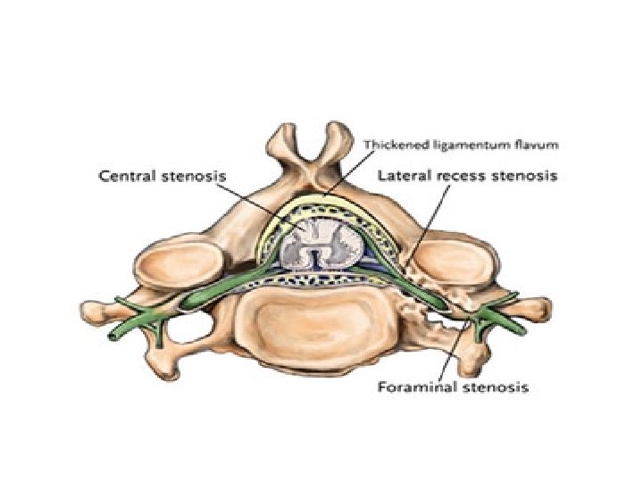 - neurologic symptoms caused mainly by central and lateral recess stenosis and to a less degree foraminal stenosis. § Central and lateral recess stenosis : • degenerative slip at L 4/5 will affect the descending L 5 nerve root in the lateral recess. - caused by slippage, hypertrophy of ligamentum flavum, and encroachment into the spinal canal of osteophytes from facet arthrosis.
