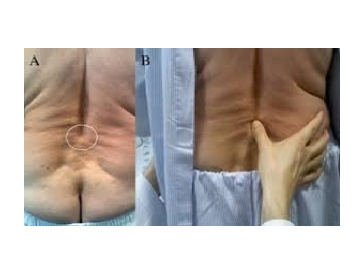 • PE : - Lumbar spine may be flat or hyperlordotic. - Flat buttocks with more vertical sacrum ( it may extend to the waist) Sometimes scoliosis. - Transverse loin creases. - Spastic gait due to hamstring tightness. - Movement of spine is stiff if degenerative. - palpable Step-off deformity.