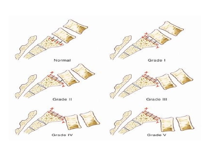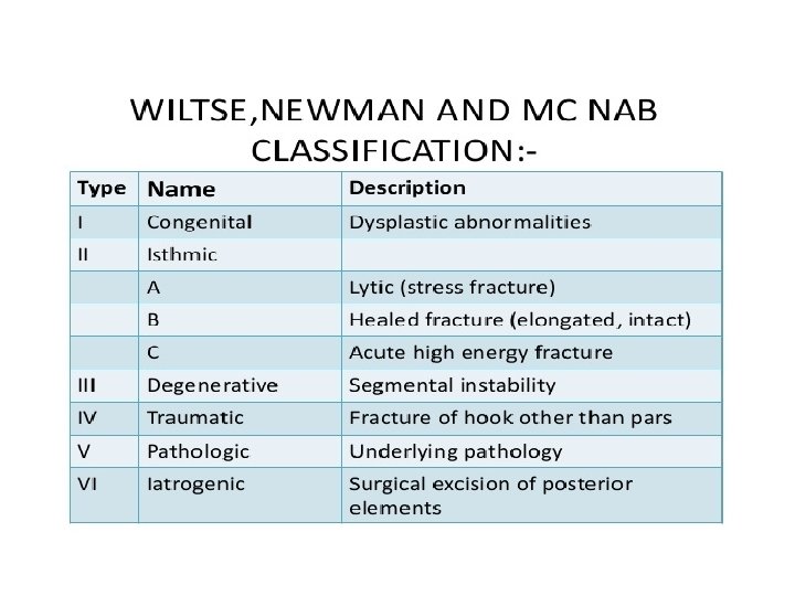 Classification • - 6 types : Isthmic ( 50%) – commonest Degenerative ( 25%) Dysplastic (20%) Pathological ( TB , neoplasm ) Post-traumatic Post-operative ( excessive bone removal in decompression ).