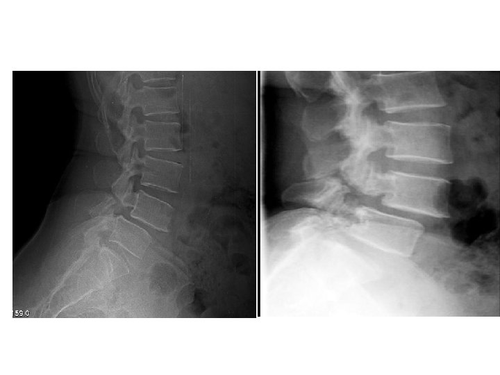 • Imaging : - X-ray : AP , lateral , oblique * on lateral view : forward slip is evident. * on oblique view : gap in pars interarticularis. - MRI : to evaluate impingement of neural elements. - CT : for bony pathology. - CT myelogram : when MRI contraindicated.