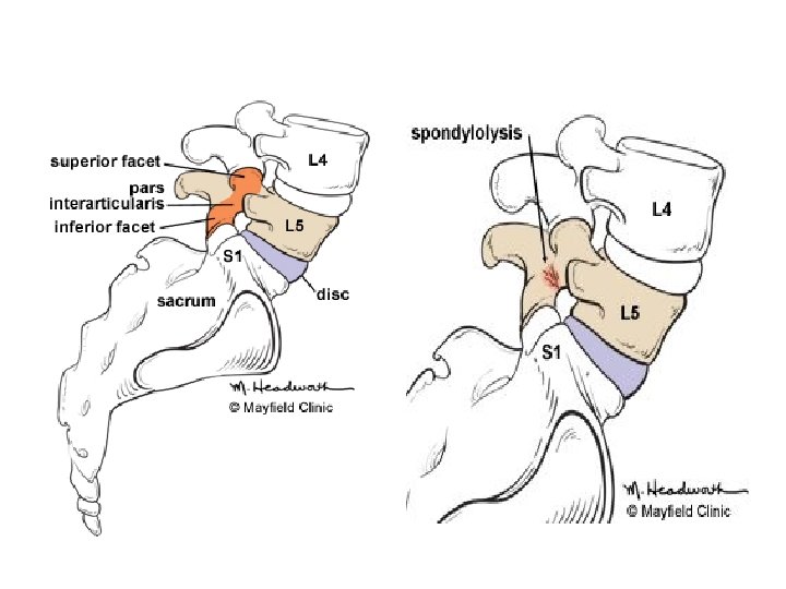 • Etiology : - mechanical factors play the major role especially when congenital abnormalities are present. - Repeated extension strains of lumbar spine makes P. I more susceptible for shear stresses. - The pars interarticularis becomes impinged from the inferior facet of the cephalad vertebrae, which results in microfractures and attempts at repair.