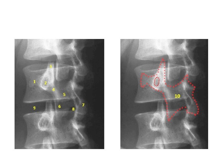 • Imaging studies : - X-ray : AP radiographic findings are usually normal in spondylolysis. The oblique views ( Rt. And Lt ) are particularly screened for the "Scotty dog" lesion in the pars interarticularis. The pars defect is represented by the collar on the Scotty dog. - ( 99 m Tc) / SPECT bone scan : superior to CT/MRI : these scans can aid in establishing the acuity of the lesion or in identifying the site of the problem in an athlete with negative plain radiography results but whose clinical course is suggestive of a pars interarticularis fracture.