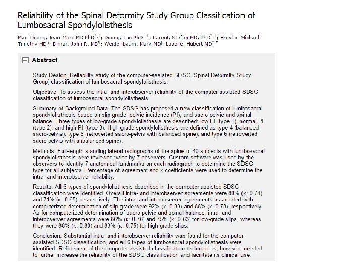 Spondylolisthesis Classification • Spinal Deformity Study Group – Based on • • Slip grade Pelvic incidence Sacro-pelvic balance Spinal balance – 7 anatomical landmarks – 6 types