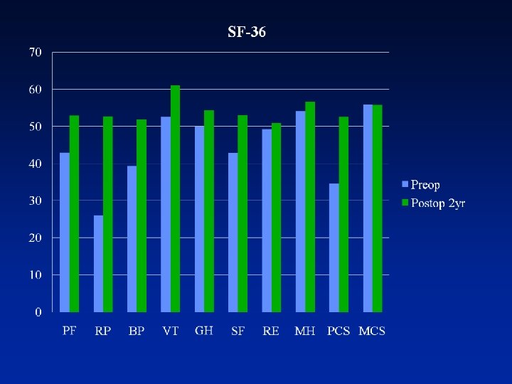 Outcome Measures Preop 3 mo 6 mo 1 yr 2 yr 32. 5 17. 8 6. 7 5. 3 RM 10. 6 6. 7 2. 0 2. 4 2. 8 VAS 8. 3 2. 0 1. 3 0. 9 0. 7 34. 6 (6. 5) 44. 7 (7. 6) 51. 5 (11. 5) 53. 3 (11. 5) 52. 5 (9. 7) ODI SF-36(PCS) Statistical analysis by repeated measures ANOVA Values in parentheses are standard deviations
