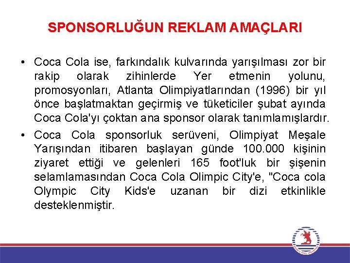 SPONSORLUĞUN REKLAM AMAÇLARI • Coca Cola ise, farkındalık kulvarında yarışılması zor bir rakip olarak zihinlerde Yer etmenin yolunu, promosyonları, Atlanta Olimpiyatlarından (1996) bir yıl önce başlatmaktan geçirmiş ve tüketiciler şubat ayında Coca Cola'yı çoktan ana sponsor olarak tanımlamışlardır. • Coca Cola sponsorluk serüveni, Olimpiyat Meşale Yarışından itibaren başlayan günde 100. 000 kişinin ziyaret ettiği ve gelenleri 165 foot'luk bir şişenin selamlamasından Coca Cola Olimpic City'e, "Coca cola Olympic City Kids'e uzanan bir dizi etkinlikle desteklenmiştir.