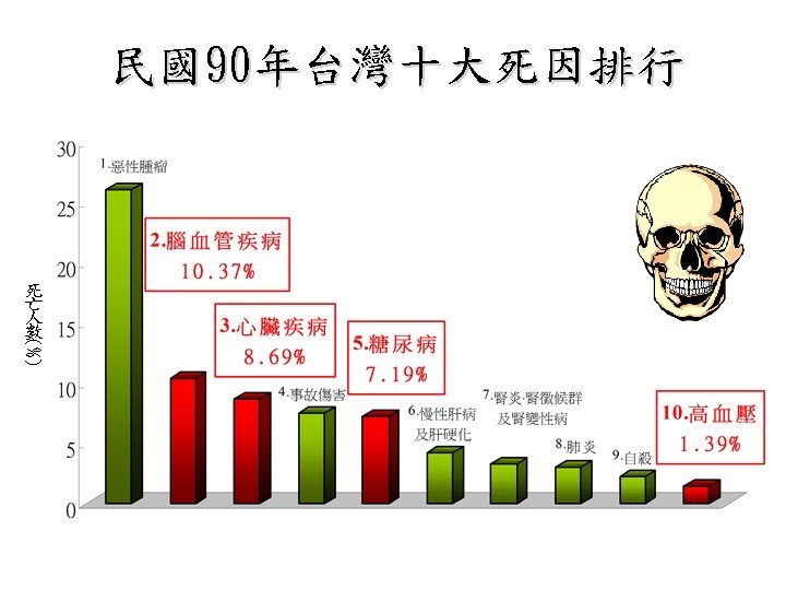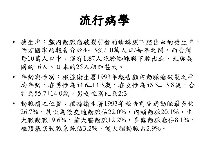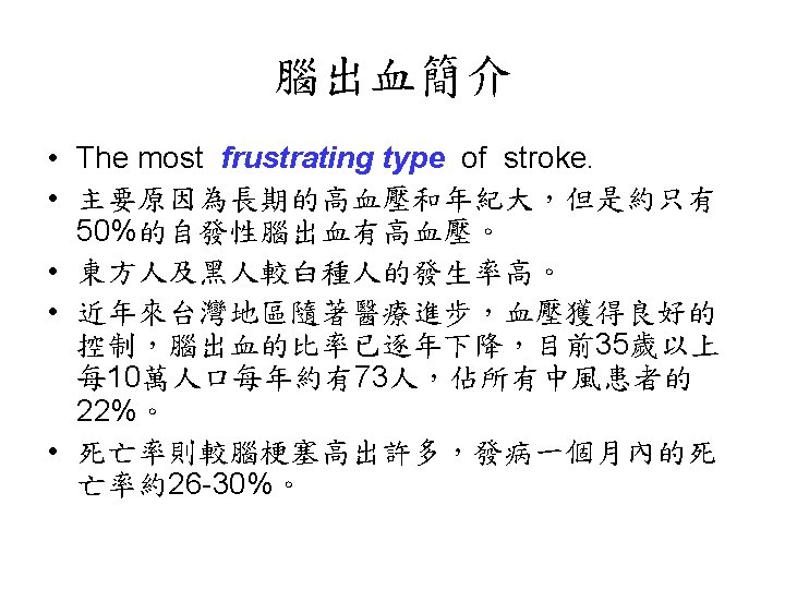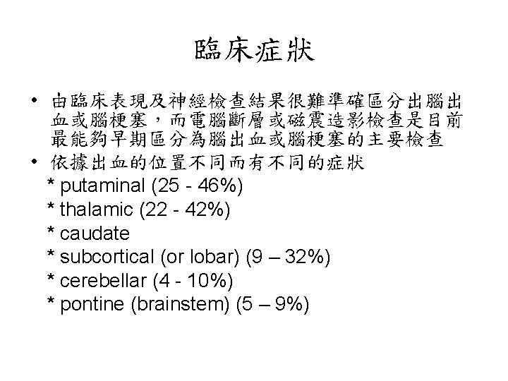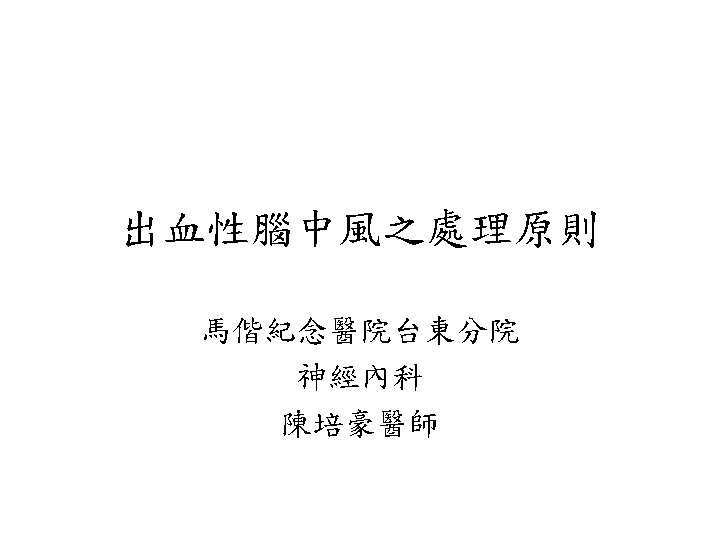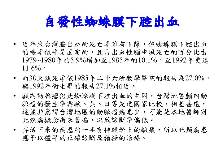 Spontaneous ICH in Taiwan, NTUH, 1993 • male/ female-- 1. 1/ 1 • prognosis-- 23 -30% death (24. 3% in patients with medical Tx. , 18. 7% in patients with medical & surgical Tx. ) • localization-- putamen 41%, thalamus 23%, combined p+t 9. 7%, subcortical area 9. 3%, brain stem 6. 5%, cerebellum 5. 9%