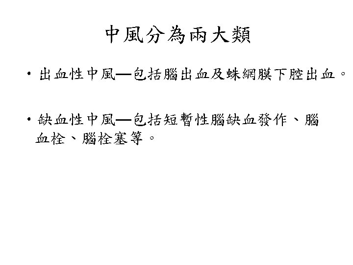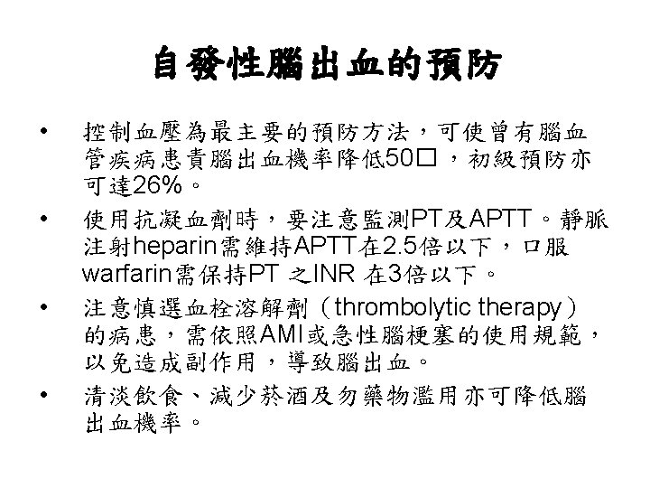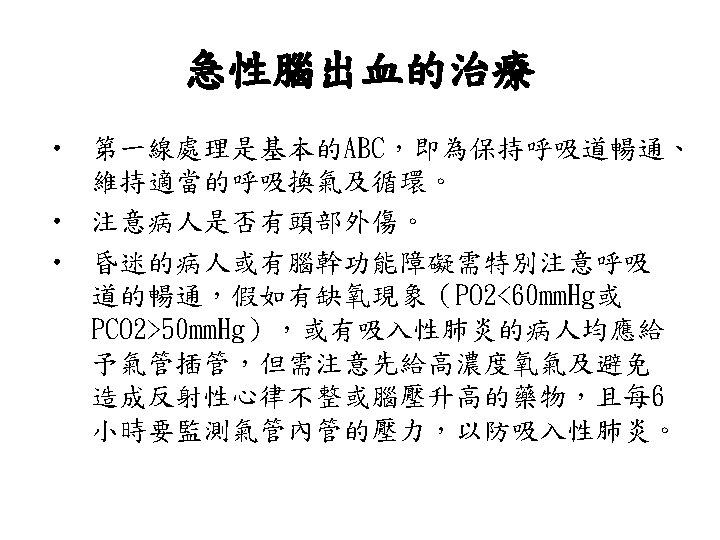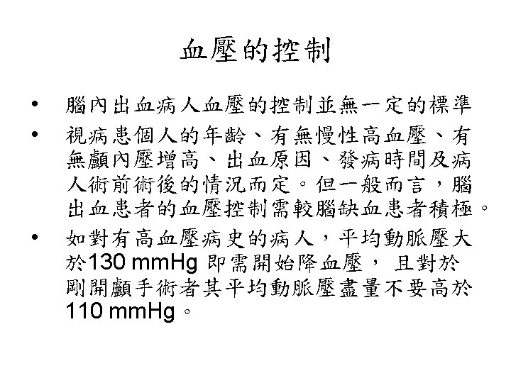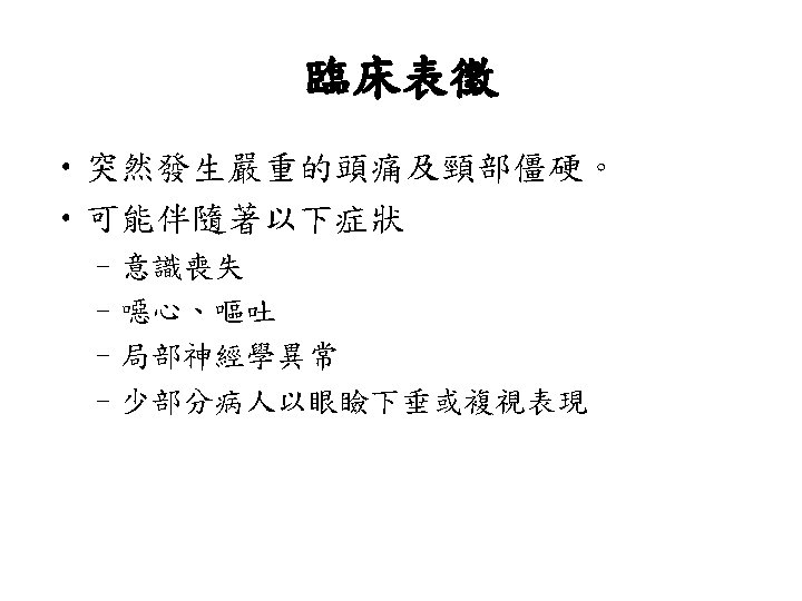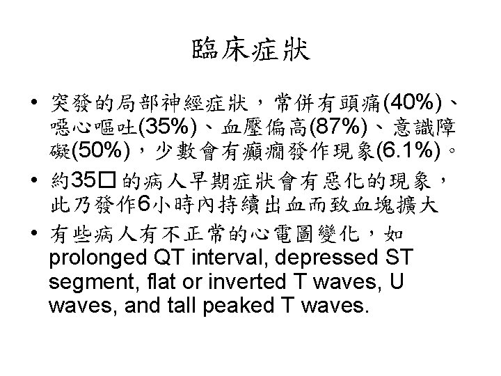 Lobar Hemorrhage • 神經學表現依血塊大小及出血位置不同而 有所不同 • Contralateral hemiparesis or sensory loss, aphasia, neglect, or confusion • Headache is common, disturbance of consciousness is milder