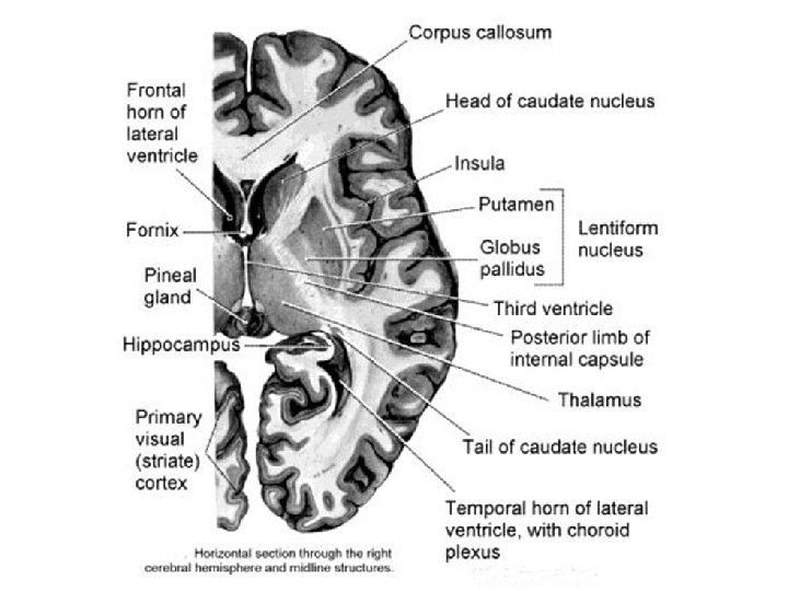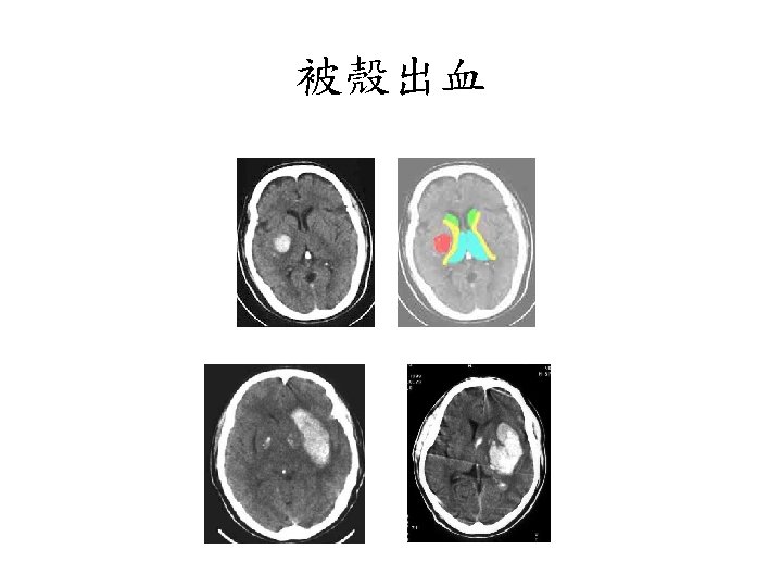 被殼出血 • • Flaccid hemiplegia Complete hemisensory deficit Homonymous hemianopsia Paralysis of conjugate gaze to the side opposite the lesion • Mild to moderate impairment of consciousness with or without headache and vomiting • Neuropsychological disorders (in some cases).