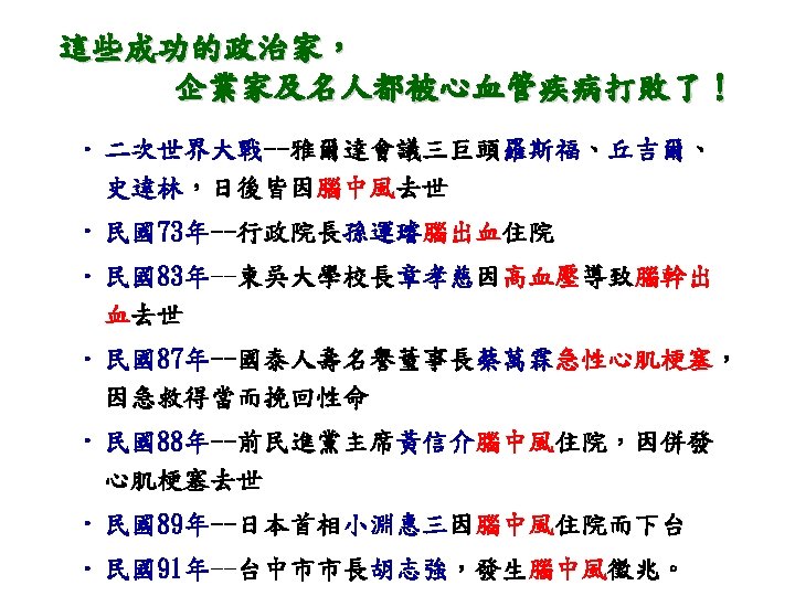 治病機轉 • • Chronic hypertension Lipohyalinosis Arterial sclerosis and fibrinoid necrosis Focal aneurysmal dilatation (Charcot. Bouchard intracerebral microaneurysm)