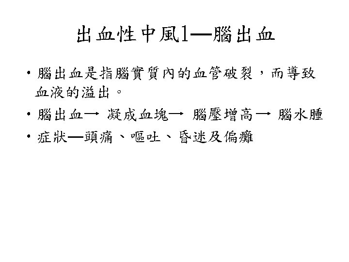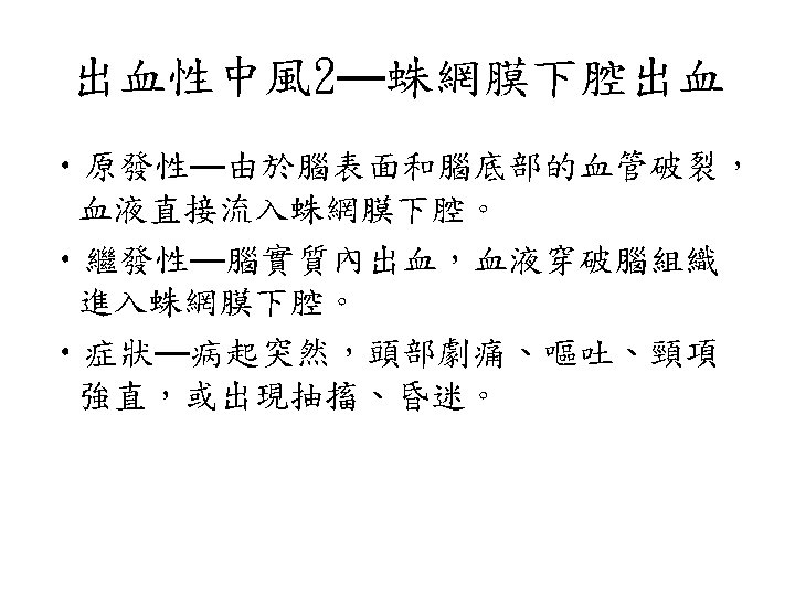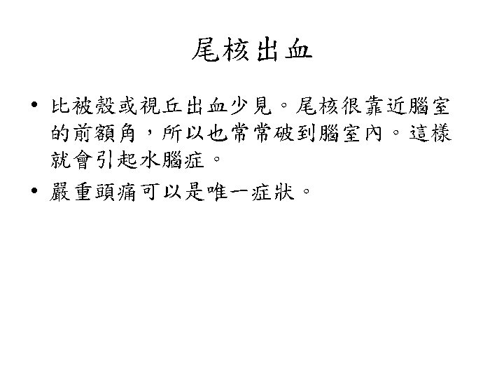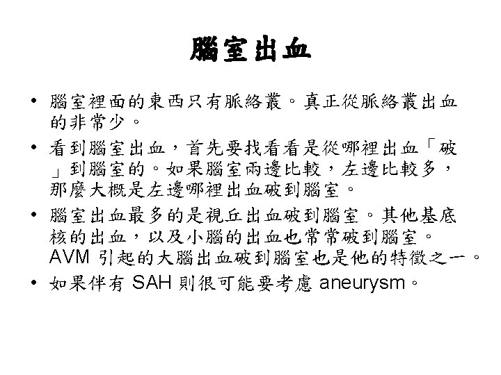 視丘出血 • similar syndromes may occur, but sensory deficit usually predominates over the other manifestations • Oculomotor signs such as forced downward gaze, convergence paralysis, and unreactive miotic pupils. • 被殼出血很大時,可以考慮手術,而視丘出血則 常常往下犯到腦幹,預後相當不好。一般比較不 考慮開刀。 • 另外,視丘非常靠近第三腦室。大部分的視丘出 血都會破到腦室裡面。這點比被殼出血常見。