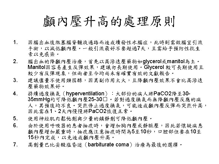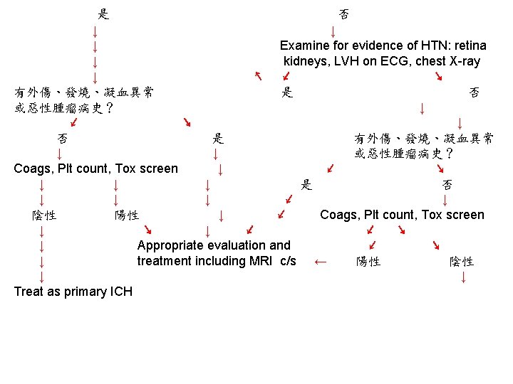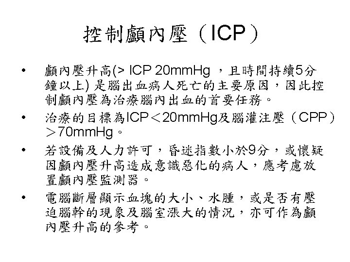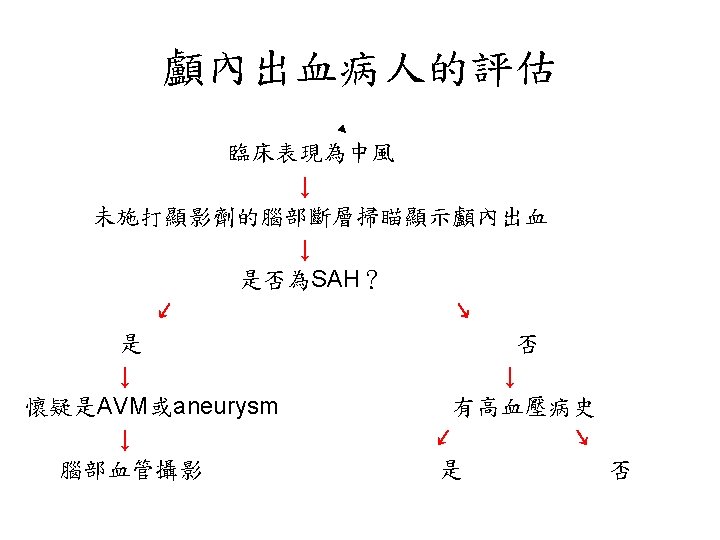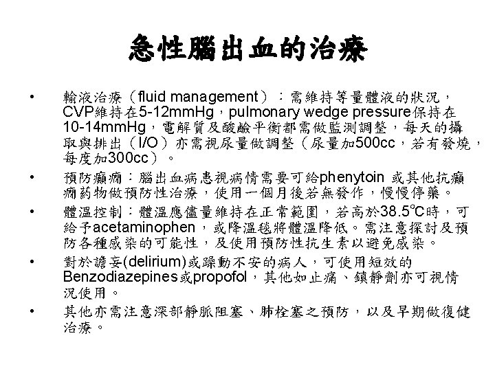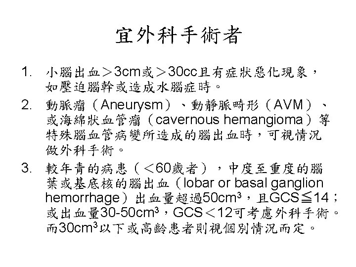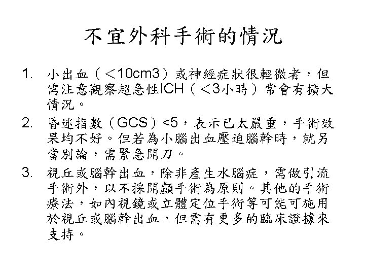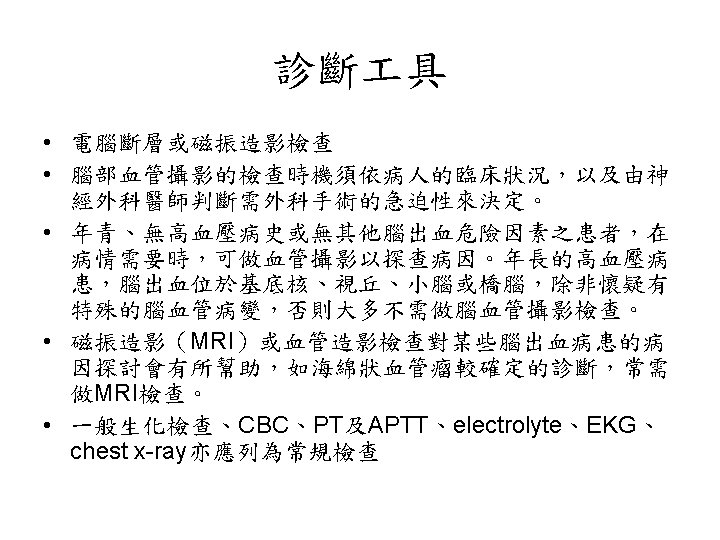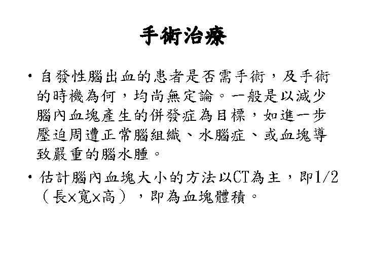 陰性 ↓ 1. Blood cultures (x 3), 2. Ischemic stroke evaluation, 3. Coagulopathy evaluation, 4. MRI c/s gadolinium, 5. Consider cerebral angiography • 血管攝影是一種侵襲性的檢查。 • 血腫的大小是評估預後最好的 具。 • Volume: estimated from CT ( A x B x C) / 2 A = the greatest diameter of hematoma B = the diameter perpendicular to A C = the thickness measured as the number of CT slices where the hematoma is visualized multiplied by slice thickness.