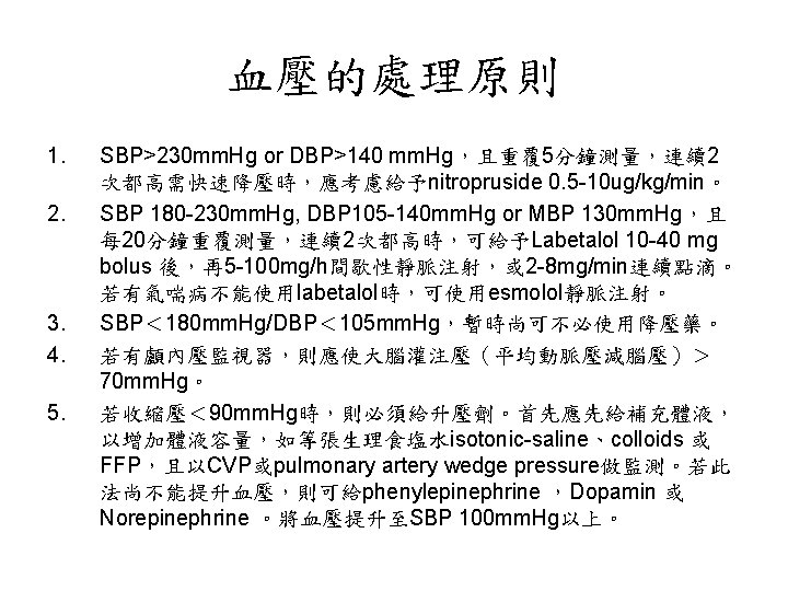 低血鈉的治療 • 治療低血鈉時,特別要注意的是要避免 volume contraction,可以等張溶液靜脈給予。 • 為了監測volume status,可以central venous pressure,pulmonary capillary wedge pressure, fluid balance及體重來評估。 • 要小心與cerebral salt wasting syndrome及 SIADS作鑑別診斷。
