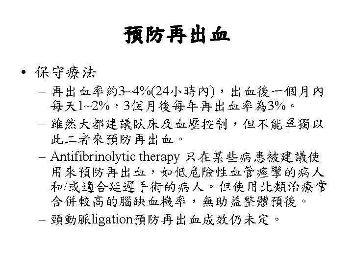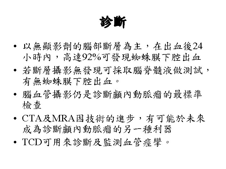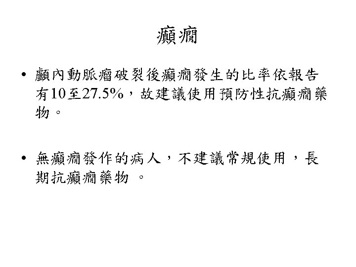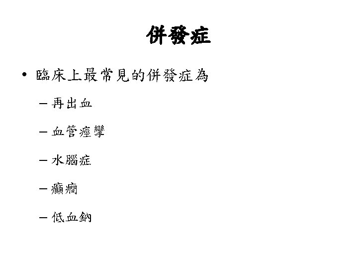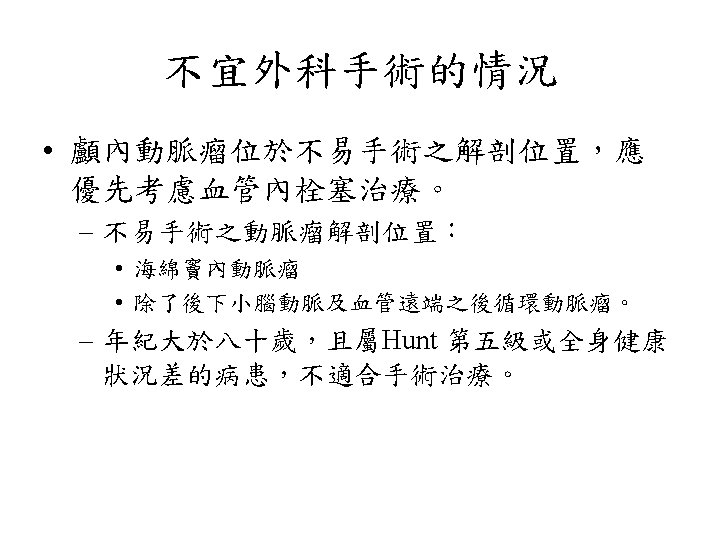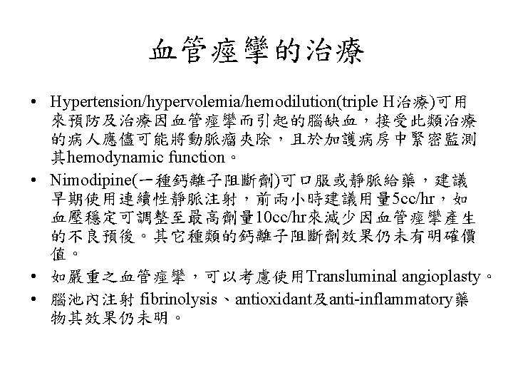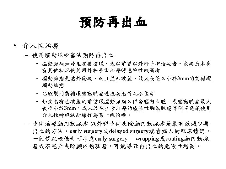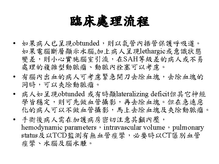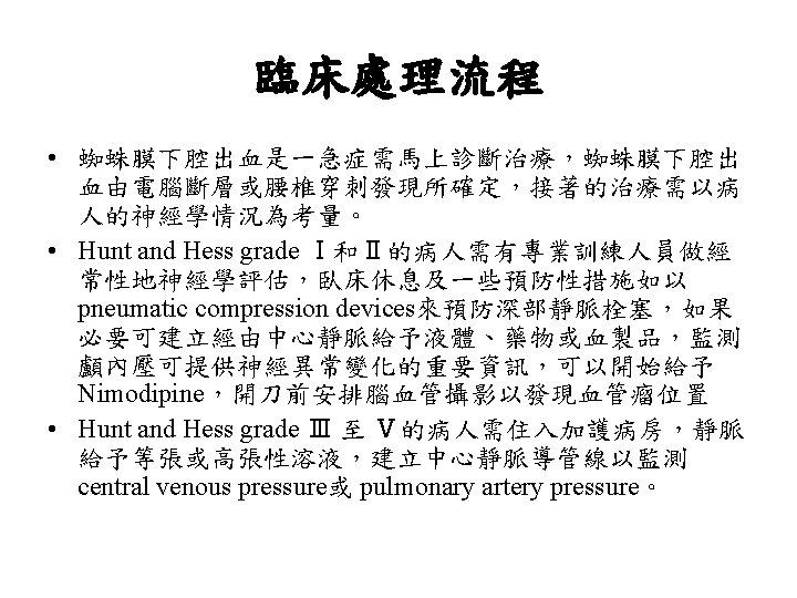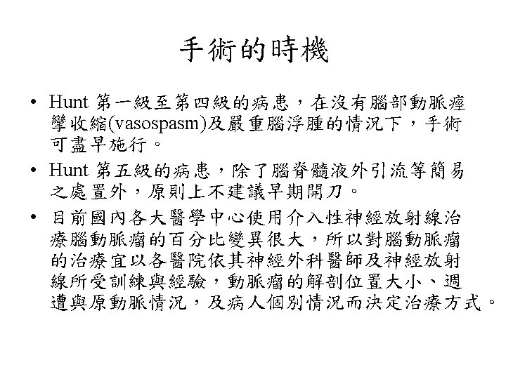 Hunt and Hess分級 • Grade 0 Unruptured aneurysm. • Grade 1 Asymptomatic or mild headache. • Grade 2 Moderate-severe headache, nuchal rigidity, cranial nerve deficits. • Grade 3 Confusion. Lethargy, mild focal symptoms. • Grade 4 Stupor, Hemiparesis. • Grade 5 Comatose.