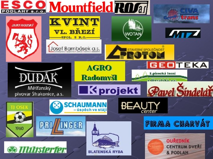 SPONZOŘI OBECNÍHO PLESU V OSEKU Prillinger spol. s r. o. Omega - Kučera 1. Písecká lesní a dřevařská společnost a. s. Esco podlahy s. r. o. Okresní správa silnic Naragross s. r. o. – Nosek Agro Radomyšl a. s. Josef Bambásek a. s. Ros a. s. Milisterfer Protom Strakonice s. r. o. Blatenská ryba Myslivecké sdružení Bárovka Ouředník - centrum dveří a podlah Truhlářství Pavel Šindelář Mountfield Wotan Forest, a. s. Vajax Strakonice Firma Charvát Civa Trans Strakonice TJ Osek Moto Zloch – Strakonice Salon Beauty center SCHAUMANN – Ing. Miroslav Kastner Měšťanský pivovar Strakonice, a. s. Jatky Hradský s. r. o. Geoteka Kvint Vlachovo Březí spol. s r. o. K-projekt Ing. Luboš Kadaně pan Miklas Vratislav pan Josef Diviš, Chrášťovice paní Soňa Kohoutová paní Věra Hochová pan Václav Vachuška pan Jindřich Babor Ing. Hana Rodinová, Ph. D Pan Suttner, Kadečka – TV servis