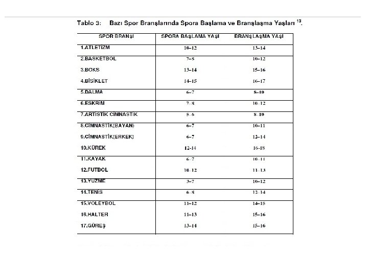 Yetenek Seçimi Aşamaları ve İçerikleri (Örnek) ÖN SEÇİM ARA SEÇİM SON SEÇİM Genel Karakteristik; Çocuğun genel özelliklerinin sorgulanması, gözlemlenmesi. Örneğin; 1. Genel Sağlık Durumu 2. Okul Başarısı 3. Sosyal koşulları ve ilgileri 4. Vücut yapısının spor türüne uygunluğu 5. Genel spor verimliliği (okulda spor derslerindeki başarı düzeyi) - Bir defalık sportif kontrol -Spor türüne özgü vücut tipine uygunluğunun kesin kontrolü -Spor türüne yönelik motorik özellik yeteneği (çok yönlü motorik özelliklerin test edilmesi) -Kısa sürede bir çok kez alıştırma yapmak (deneme antrenmanı) -Kısa süreli bir alıştırmada verim düzeyi ve davranış biçimi -Genel ve özel sportif verimliliği -Bütünüyle kişiliğin değerlendirilmesi Artistik Jimnastik; -Kısa boylu, oldukça az ağırlıklı ince bir tip, ancak omuz kalçadan geniş -Genel hareket koordinasyonunun ve kuvvet düzeyinin değerlendirilmesi -Toplam estetik ifade değerlendirilmesi -Hareket koordinasyonu (engellerle yapılan koşudaki başarısı) -Bacak, kol, gövdenin sahip olduğu kuvvet (basit kuvvet alıştırmaları) -Toplam motorik özellikler düzeyi (sportif oyunlarda yapılan yarışmalar) -Kısa süreli program sonucunun değerlendirilmesi; -Motor öğrenme davranışı (hareket koordinasyonu) -Kuvvet ve hareket sürati -Hareket genişliği Sportif Oyunlar; -Uzun boylu ve iri yapılı çocuklar (Voleybol, Hentbol, -Yeterli bir boy aranmalı -Koşu hızı (30 -60 m. ’deki) -Çabuk kuvvet (fırlatma -Bir çok oyunda oyun yeteneğinin değerlendirilmesi -Problemlere bulduğu