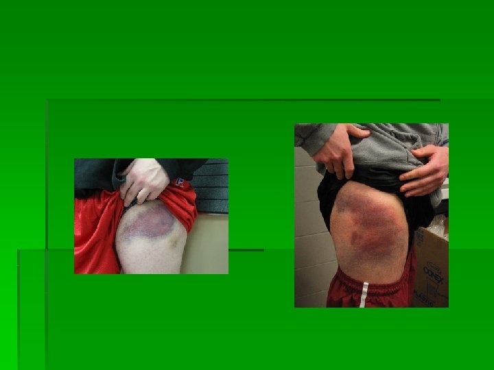 Sport Injuries Contusions - An external blow causes soft tissue to be compressed against hard bone underneath - Capillaries are torn, which allows bleeding into tissues causing blue-purple discoloration - Calcium deposits may result with repeated trauma Management: RICE and protect this injury
