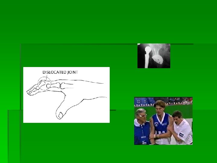 Sport Injuries Dislocations - Occurs when one bone in a joint is forced out of its normal alignment (ie. shoulder). - Often results in rupture of surrounding tissue. - Joint is vulnerable to more dislocation. - Dislocations should never be immediately reduced, need to rule out fracture possibility - Management: RICE. Reduced by physician only! Before taken to physician, injury should be splinted.