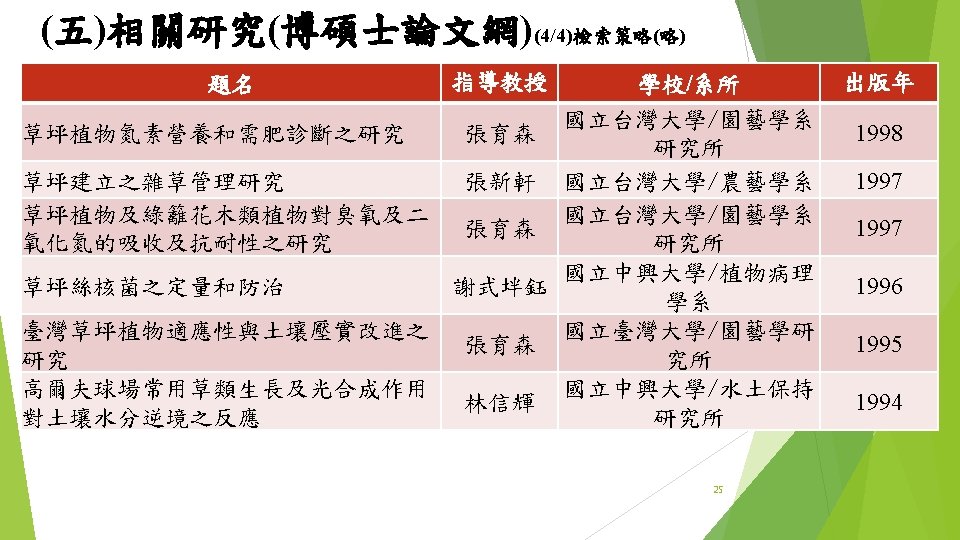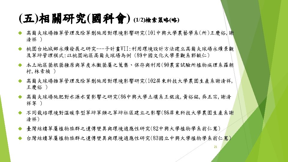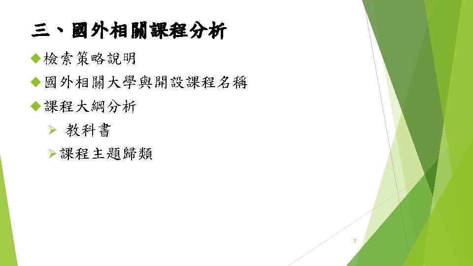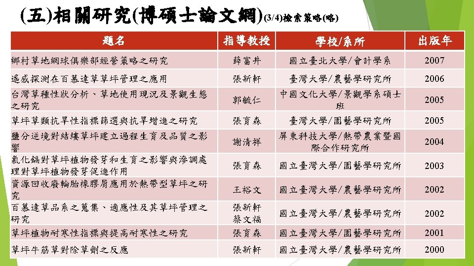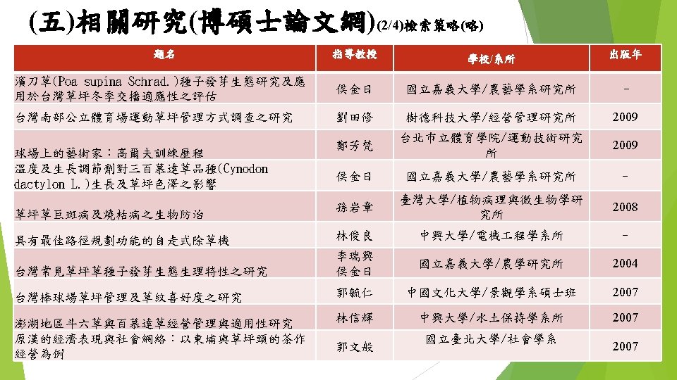 (一)檢索策略說明 關鍵字組合 Ø (Sport Turf OR Sport Lawn OR Turf Management) AND syllabus 檢索日期: 2013. 07. 21 and 2013. 10. 25 可取得完整課程大綱內容為主 Ø 大學有開設課程但無法取得課程大綱者, 不在本次分析範圍內, 例如: * University of Maryland (Turfgrass Management) * North Dakota State University (SPORTS And URBAN TURFGRASS MANAGEMENT) * Iowa State University (Turfgrass Establishment and Management) * Oregon State University (Turf Management Option) * … 8