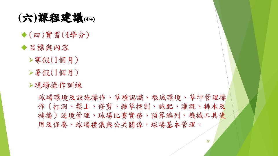 (六)課程建議(3/4) (三)高爾夫球場草坪專業管理(含逆境管理)(3學分) 1. Golf and Turfgrass. (高爾夫球場和草坪) 2. Designing and Building a Golf Course. (設計和建構高爾夫球場) 3. The Putting Green. (果嶺) 4. The Tee. (發球區) 5. The Fairway. (球道) 6. The Rough. (長草區) 7. The Bunker. (沙坑) 8. Golf Course Equipment and Facilities. (高爾夫球場設備及設施) 9. The Irrigation System. (灌溉系統) 10. Pests and Stresses. (害蟲及其影響力) 11. Golf Course Management. (高爾夫球場管理) 12. Other Golf Course Operations. (其他高爾夫球場的運作) 13. 交播技術? 28