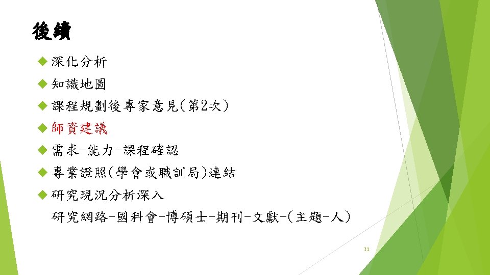 (三)課程大綱分析-教科書 代碼 教科書 A 未提供 B 1. Turfgrass Management 9 th Ed. – A. J. Turgeon 2. Botany for Gardeners 3 rd Edition –Capon, Brian C 未提供 D 未提供 E Turfgrass Management 9 th Ed. – A. J. Turgeon F 未提供 G 1. Fundamentals of Turfgrass Management 4 th Ed. , N. E. Christians 2. Weed Control in Turf and Ornamentals 1 st Ed. , A. J. Turgeon, L. B. Mc. Carty, N. E. Christians 3. The Mathematics of Turfgrass Maintenance, 4 th Ed. , N. E. Christians and M. L. Agnew H Murphy, T. , Colvin, D. , Dickens, R. , Everest, J. , Hall, D. & Mc. Carty, B. (1996). Weeds of Southern Turfgrasses. Cooperative Extension Service - The University of Georgia. Athens, AL. I Turfgrass Management 5 -8 th Ed. – A. J. Turgeon J 1. Turfgrass Soil Fertility and Chemical Problems: Assessment and Management. R. N. Carrow, D. V. Waddington, and P. E. Rieke. 2002. 2. Best Golf Course Management Practices. 2 nd Edition. L. B. Mc. Carty. 2005. 10 3. The Superintendent’s Guide to Controlling Green Putting Green Speed. T. A. Nikolai. 2004. 4. Practical Drainage for Golf, Sportsturf and Horticulture. K. Mc. Intyre and B. Jakobsen. 2000.
