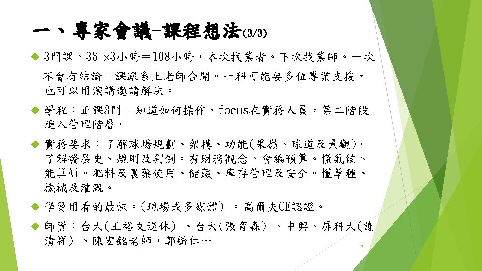 (四)課程大綱分析-課程主題分類 分類 課程主題 (開課學校代碼) 環境科學 Land Surveying (A)、Turfgrass Environment (E/I)、Turfgrass Soil Physical Properties (E/J)、Turfgrass Soil Chemistry (E)、Soil and Soil management (F/H/I/J)、Climate (G) 運動科學 Design of the Golf Environment (A)、Golf Course Operations (A/F)、Athletic Field Management (A/F)、 Sports field construction (D/G/I)、Sports field maintenance (D) 草坪管理 Turfgrass Insects (A/E/F/G/H/I)、Turfgrass Diseases (A/E/F/G/H/I)、Turf Management (A/F/H)、 Turfgrass Weed Management (A/E/F/G/I)、Warm and Cool Season Grasses (B/E/FG/H/I)、Turfgrass Nutrition (E/J)、Irrigation and Mowing (E/F/G/H/I/J)、Professional Lawn Care (F)、Sod Production (G/H/I)、Measuring Turfgrass (H)、Turf Use and Function (I)、Drainage (J)、Rootzone Construction (J) 植物科學 Plant Biology (A)、Principles of Plant Pathology (A)、Plant Science (A)、Plant Materials (A)、 Introduction to Weed Science (A)、Turf Plant Parts (B)、How Turf Uses Water (B)、How Turf Plants Move Food & Nutrients (B)、How Turf Makes its Own Food (B)、How Turf Gets Energy (B)、 Biotechnology (B/I)、Perennial ryegrass et. al (D/H)、Seed certification and seed testing (D/F)、 Propagation (E/G)、Agrostology (G)、Fertilization (G/H/I/J) 園藝學 Landscape Architecture Construction (A)、Arboriculture and Landscape Maintenance (A) 農業機械 Machinery Management for Agro-Ecosystems (A) Survey of Chemistry (A)、Elementary Organic Chemistry (A)、Principles of Macroeconomics (A)、 13 Introduction to Human Resource Management (A)、Emergency Health Care (A) *C是行程參訪 其他領域