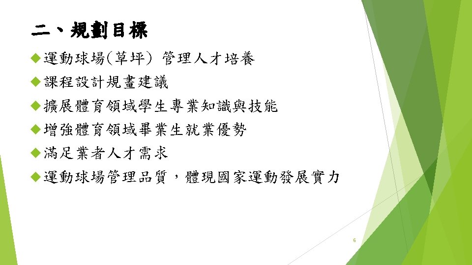 2. 運動科學 Design Golf of the Golf Environment (A) (高爾夫環境設計) Course Operations (A/F) (高爾夫球場的運作) Athletic Field Management (A/F) (田徑場管理) Sports field construction (D/G/I) (運動場建構) Sports field maintenance (D) (運動場維護) 15